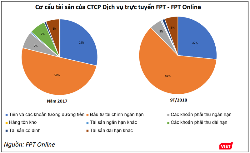 Tới cuối Quý 3/2018, tổng tài sản của FPT Online tăng lên mức 1.019 tỷ đồng, trong đó, các khoản Tiền và tương đương tiền, Đầu tư tài chính ngắn hạn tiếp tục có sự gia tăng tỷ trọng, chiếm tới 88%.