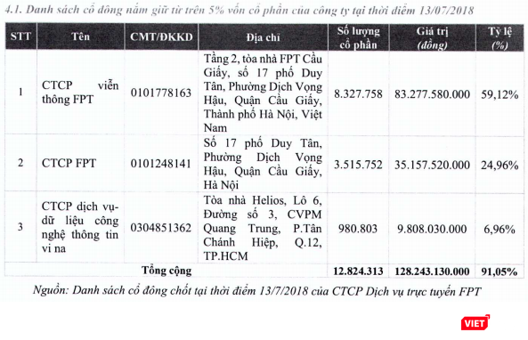 Mặc dù vậy, cơ hội đầu tư vào FPT Online đối với các nhà đầu tư mới cũng sẽ không nhiều. Được biết, cơ cấu cổ đông của FPT Online khá cô đặc với sự góp mặt của 3 cổ đông lớn chiếm tới 91,05%, bao gồm: CTCP viễn thông FPT (chiếm 59,12%), CTCP FPT (chiếm 24,96%) và CTCP Dịch vụ Dữ liệu công nghệ thông tin Vi na - thành viên của Tập đoàn VNG (chiếm 6,96%).