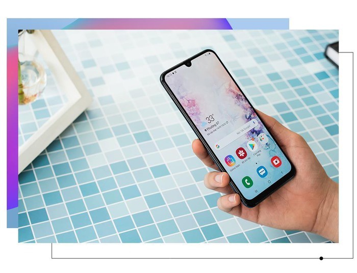 Với thiết kế này, màn hình 6,4 inch của Galaxy A50 đạt tỷ lệ hiển thị cao nhất có thể, góc nhìn rộng, độ sáng rõ, sắc nét và tái hiện được màu đen sâu. Người dùng sẽ cảm nhận chất lượng màn hình rõ nhất khi xem video và chơi game, không có cảm giác mỏi mắt hay bị gián đoạn bởi viền màn hình, phím điều hướng lẫn camera trước.