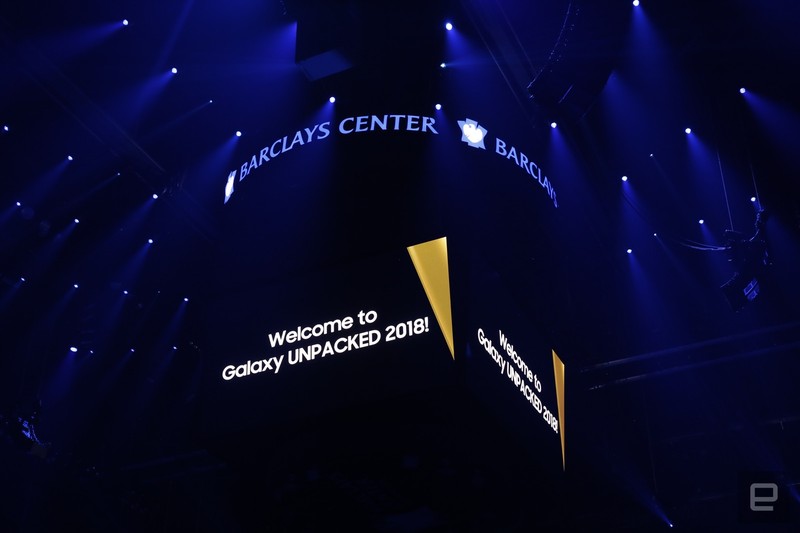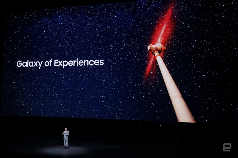 Nhân viên của Samsung đẩy các chiếc bàn ra giữa sân khấu, trên đó có để các thiết bị vừa ra mắt. Người tham dự được mời lên sân khấu để trải nghiệm sản phẩm