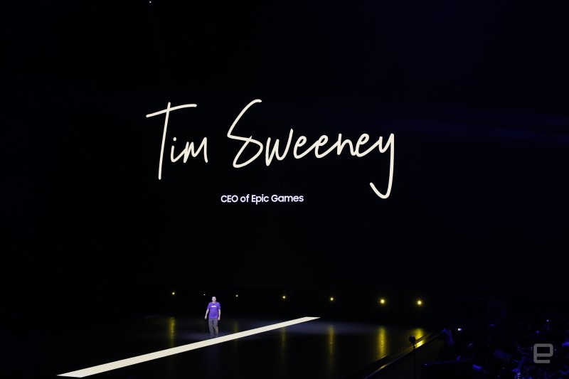 Ông Tim Sweeney, CEO của hãng Epic Games lên sân khấu giới thiệu về tựa game Fornite được thiết kế cho Galaxy Note 9