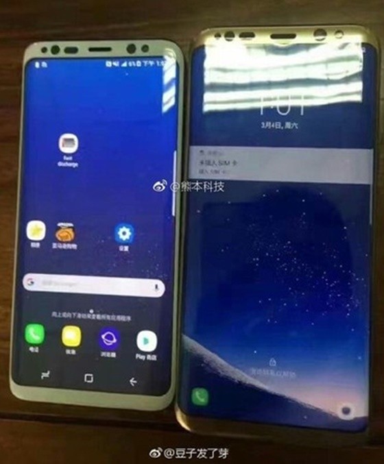 Những hình ảnh rò rỉ mới nhất cho chúng ta cái nhìn cận cảnh về chiếc Galaxy S8+ phiên bản Gold. Ngoài ra, nguồn tin cũng đăng tải thêm một bức ảnh Galaxy S8+ khi đặt cạnh Galaxy S8. Quan sát nhanh màn hình khóa chúng ta thấy ứng dụng cuộc gọi và thanh điều hướng sẽ nằm phía lề trái màn hình trong khi nút Home vật lý không xuất hiện.