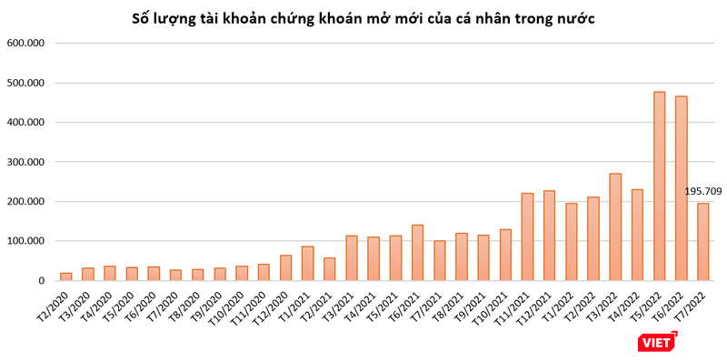 Số liệu từ Trung tâm lưu ký Chứng khoán Việt Nam (VSD) cho biết, nhà đầu tư cá nhân trong nước tiếp tục mở mới 195.709 tài khoản trong tháng 7/2022, giảm 58% so với số tài khoản mở mới trong tháng 6.