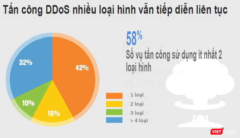 Verisign quan sát thấy 58% các vụ tấn công DDoS đã được giảm nhẹ trong quý I/2018 sử dụng nhiều loại hình tấn công khác nhau. So với quý 4/2017, số vụ tấn công tăng 53%, quy mô tấn công đỉnh điểm tăng 47%, tuy nhiên con số này giảm 21% so với cùng kì năm ngoái.