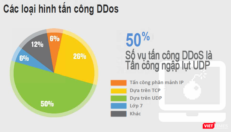 Theo Verisign, trong số các vụ tấn công DDOS, 50% số vụ tấn công là ngập lụt UDP (User Datagram Protocol), tấn công dựa trên TCP là hình thức tấn công phổ biến thứ 2, chiếm 26% các loại hình tấn công trong quý này