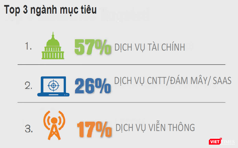Ngành Tài chính là ngành thường xuyên bị tấn công nhất trong quý I/2018, chiếm 57% trong tổng số các hoạt động giảm thiểu. Ngành CNTT/ Đám mây/ SaaS có số lần tấn công DDoS cao thứ hai, chiếm 26% hoạt động giảm thiểu, tiếp theo là ngành viễn thông, chiếm 17%.