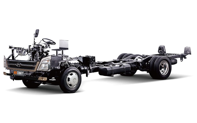 Theo Hyundai Thành Công, New County sử dụng khung gầm được làm bằng thép cao cấp, hệ thống treo nhíp lá, giảm chấn thủy lực và thanh cân bằng giúp chiếc xe đảm bảo độ vững chắc, chống xoắn vặn và vận hành êm ái trên mọi địa hình.