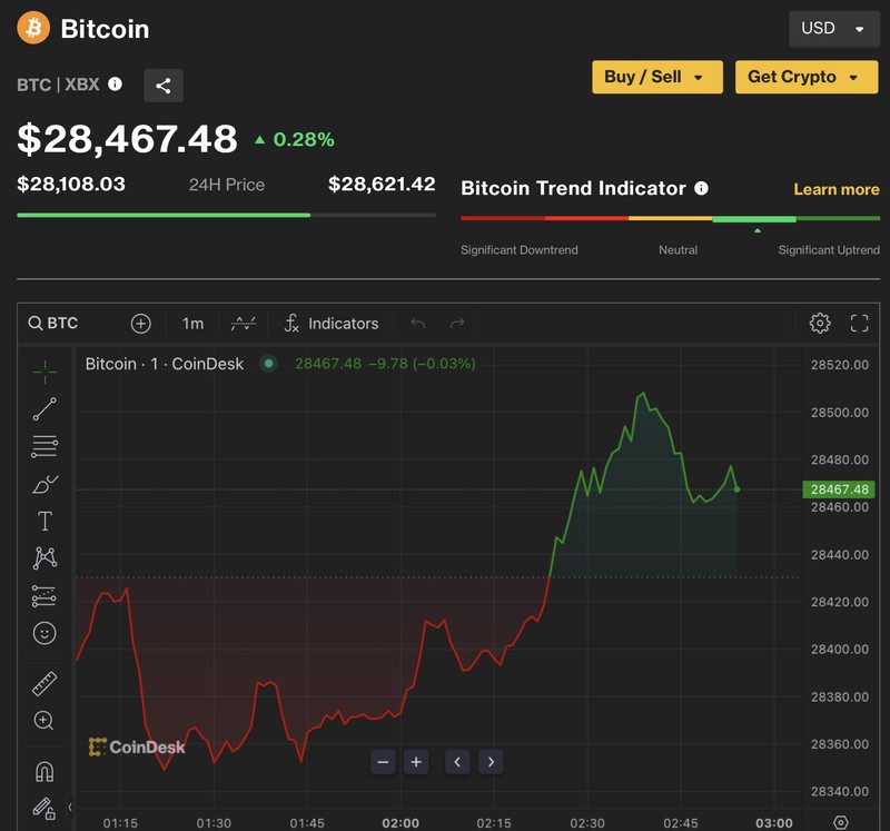 Theo dữ liệu của Coindesk, cập nhật tới 9h55 ngày 18/10 (theo giờ Việt Nam), giá Bitcoin giao dịch ở mức 28.467,48 USD/BTC, tăng nhẹ 0,28% trong 24 giờ qua. Thanh khoản của đồng tiền mã hóa có vốn hóa lớn nhất thị trường ở mức 27,64 tỉ USD, giảm 60,22% so với ngày 17/10. Vốn hóa của Bitcoin đạt 555,99 tỉ USD, chiếm 50,4% tổng vốn hóa của thị trường tiền mã hóa.