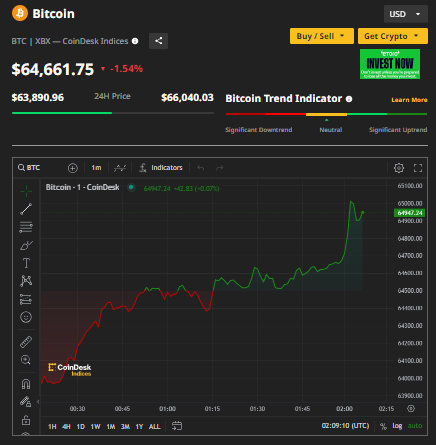 VietTimes – Giá Bitcoin giao dịch ở mức 64.661,75 USD/BTC, giảm 1,54% trong 24 giờ qua.