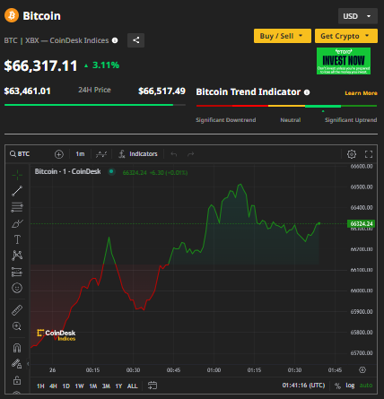 VietTimes – Giá Bitcoin giao dịch ở mức 66.317,11 USD/BTC, tăng 3,11% trong 24 giờ qua.