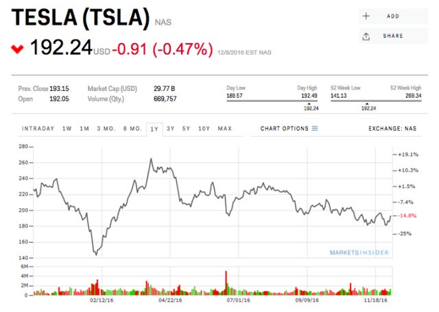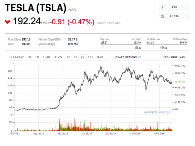 Cổ phiếu Tesla giảm lần đầu tiên vào năm 2013 và một số thời điểm khác, trong khi nó đạt đỉnh vào mùa thu năm 2014. Từ thời điểm đó, giá trị của công ty lên xuống thất thường, đặc biệt cuối năm 2015. Trong khoảng 5 năm, lợi nhuận của Tesla đạt 525%.
