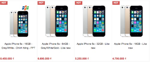 Nếu trước Tết, 5s bản thấp nhất (dung lượng 16GB) giá gần 6 triệu đồng, thì nay, nhiều cửa hàng ở Hà Nội đã hạ xuống dưới 5 triệu đồng. Bản màu đen hay trắng chỉ còn 4,8 triệu đồng, trong khi đó, bản màu vàng, do nhu cầu nhiều hơn cũng như được chuộng nên có giá 5 triệu đồng. Hàng khoá mạng (lock) chỉ còn khoảng 4 triệu đồng, ngang với những chiếc iPhone 5 hay 5c bản quốc tế thời điểm trước Tết.
