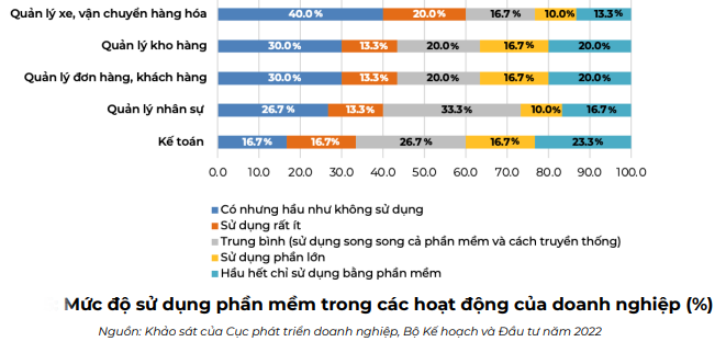 Tuy nhiên, theo kết quả khảo sát, các doanh nghiệp Việt Nam chủ yếu đang ở bước số hóa, đã áp dụng các công nghệ, phần mềm mới để nhưng chưa đạt được mục tiêu đề ra nên ngừng sử dụng, hoặc vẫn dùng nhưng gặp khó khăn.