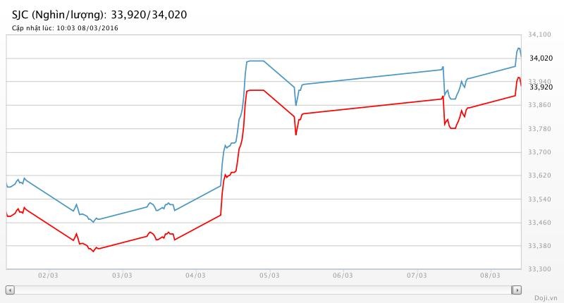 Trong khi, tại Doji, giá vàng miếng SJC lại được Tập đoàn điều chỉnh tăng 70 đồng mỗi chiều lên niêm yết ở 33,92 – 34,02 triệu đồng/lượng (MV-BR) đối với giao dịch lẻ; và đắt hơn 10 nghìn đồng chiều mua, đồng thời rẻ hơn 10 nghìn đồng chiều bán đối với giao dịch buôn ở thị trường Hà Nội. Hiện, doãng chênh lệch 2 chiều mua-bán ở Doji vẫn là 100 nghìn đồng/lượng.