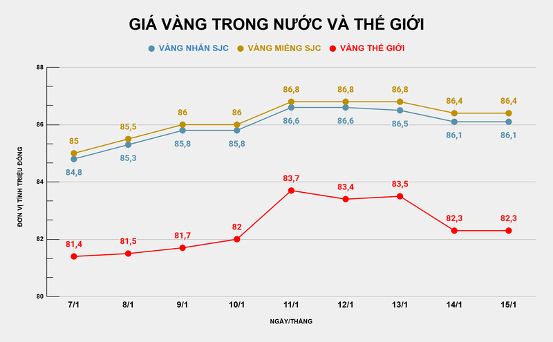 Theo GoldPrice, ghi nhận sáng nay theo giờ Việt Nam giá vàng thế giới giao dịch ở mức 2.671 USD/Ounce, quy đổi theo tỷ giá USD, tại ngân hàng BIDV (25.554 VND/USD), vàng thế giới có giá khoảng hơn 82.300.000 đồng/lượng (chưa tính thuế, phí). Như vậy, giá vàng miếng SJC hiện đang cao hơn giá vàng thế giới khoảng 4,1 triệu đồng/lượng. Theo đó, giá vàng thế giới đi ngang so với sáng hôm qua (14/1).