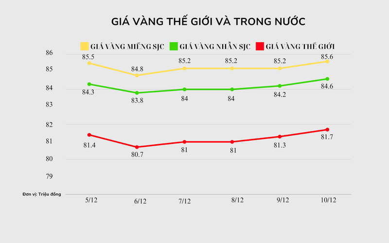 Về giá vàng thế giới, theo GoldPrice, ghi nhận sáng nay theo giờ Việt Nam giá vàng thế giới giao dịch ở mức 2.660,6 USD/Ounce, quy đổi theo tỷ giá USD, tại ngân hàng BIDV (25.460 VND/USD), vàng thế giới có giá khoảng 81.700.000 đồng/lượng (chưa tính thuế, phí). Như vậy, giá vàng miếng SJC vào rạng sáng hôm qua đang cao hơn giá vàng quốc tế khoảng 3,5 triệu đồng/lượng. So với sáng 9/12, giá vàng thế giới tăng khoảng 400.000 đồng.