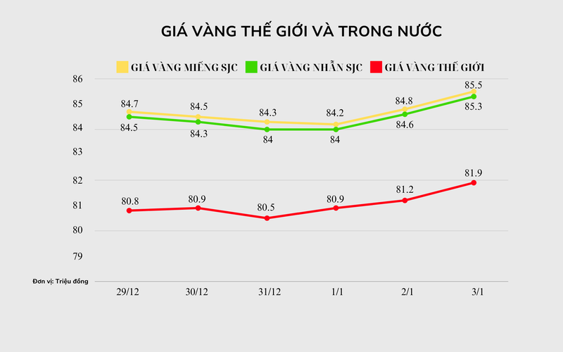 Biểu đồ giá vàng trong nước và thế giới theo đơn vị tính triệu đồng. Ảnh: VietTimes.