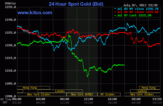 Chốt phiên giao dịch cuối tuần (Thứ Sáu ngày 7/7), giá vàng giao tháng Tám trên sàn Comex tại Sở Giao dịch New York Mercantile trượt $13,60 (-1,1%) xuống chốt tại $1.209,70/oz – thấp nhất kể từ trung tuần tháng Ba, theo dữ liệu của FactSet. Tính chung cả tuần qua, giá vàng giảm tổng cộng 2,6%, đánh dấu tuần suy thứ năm liên tiếp.