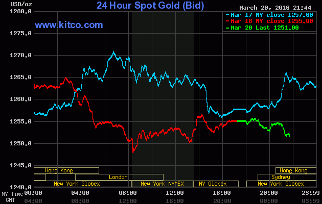 Chốt phiên giao dịch cuối tuần trước (Thứ Sáu ngày 18/03), giá vàng giao tháng Tư trên sàn Comex tại Sở giao dịch New York Mercantile đảo chiều giảm mạnh $10,70 (-0,9%) xuống đóng cửa ở $1.254,30/oz; Trước đó, vàng đã leo sốc tới 2,9% trong phiên Thứ Năm. Tính chung cả tuần, vàng giảm 0,4% - đánh dấu tuần mất giá thứ 4 trong 5 tuần gần nhất.