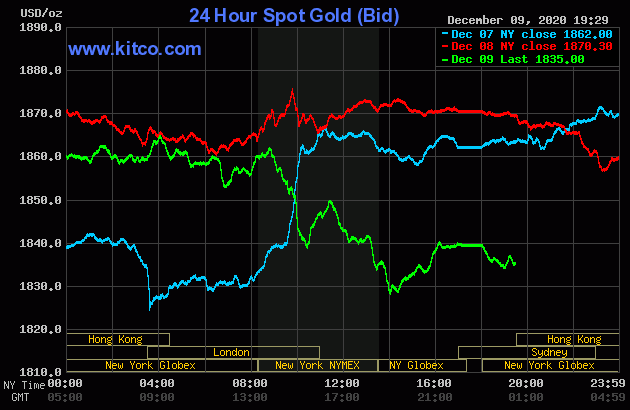 Trên Kitco.com, tại thời điểm 7h30 sáng ngày hôm nay 10/12 (theo giờ Việt Nam), giá vàng giao ngay được giao dịch ở mức 1.835 USD/ounce, giảm 35 USD so với giá kết phiên giao dịch gần nhất. Giá vàng giao tháng 12/2021 trên sàn Comex New York được giao dịch ở mức 1.854 USD/ounce.