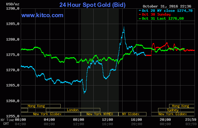 Chốt phiên giao dịch đầu tuần (Thứ Hai ngày 31/10), giá vàng giao tháng Mười hai trên sàn Comex tại Sở giao dịch New York Mercantile trượt $2,50 (-0,2%) về đóng cửa ở $1.274,30/oz. Căn cứ theo số liệu cùa FactSet, tính trong cả Tháng Mười, giá kim loại quý này đã mất 3%.