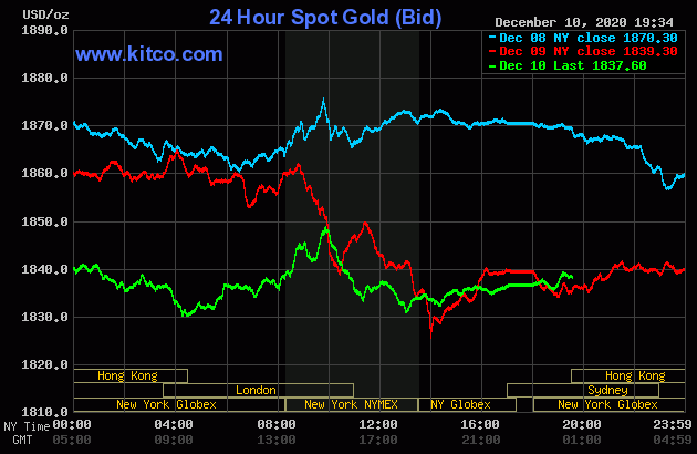 Trên Kitco.com, tại thời điểm 7h30 sáng ngày hôm nay 11/12 (theo giờ Việt Nam), giá vàng giao ngay được giao dịch ở mức 1.837 USD/ounce, giảm 2 USD so với giá kết phiên giao dịch gần nhất. Giá vàng giao tháng 12/2021 trên sàn Comex New York được giao dịch ở mức 1.850 USD/ounce.