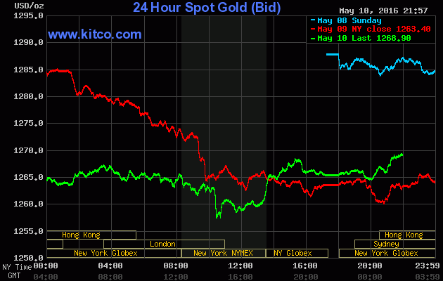 Chốt phiên giao dịch Thứ Ba (ngày 10/5), giá vàng giao tháng Sáu trên sàn Comex tại Sở giao dịch New York Mercantile giảm nhẹ $1,80 (+0,1%) xuống đóng cửa ở $1.264,80/oz. Trước đó, giá vàng thế giới phiên thứ Hai giảm 2,1% và kết thúc ở mức thấp nhất kể từ ngày 27/4.