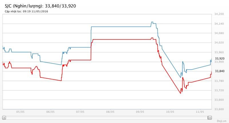 Tính đến thời 9h13’ sáng nay, Công ty TNHH Một thành viên Vàng bạc đá quý Sài Gòn (SJC) đang yết giá vàng miếng SJC ở 33,76 - 33,96 triệu đồng/lượng (MV-BR), tăng 80 nghìn đồng so với chốt phiên trước đó.