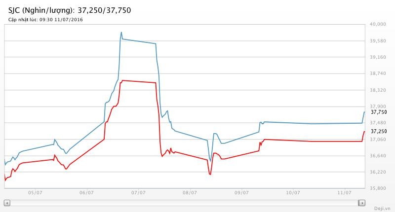 Cụ thể, đến thời điểm 9h30’ sáng nay, giá vàng miếng SJC của Công ty TNHH Một thành viên Vàng bạc đá quý Sài Gòn (SJC) đang đứng ở 37,20 – 37,90 triệu đồng/lượng (MV-BR), tăng mạnh 300 nghìn đồng mỗi chiều so với chốt phiên trước đó.