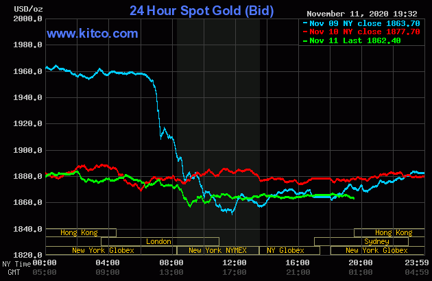Trên Kitco.com, tại thời điểm 7h30 sáng ngày hôm nay 12/11 (theo giờ Việt Nam), giá vàng giao ngay được giao dịch quanh mức 1.862,4 USD/ounce, giảm khoảng 15 USD so với giá kết phiên giao dịch gần nhất. Giá vàng giao tháng 6/2021 trên sàn Comex New York được giao dịch ở mức 1.885 USD/ounce.