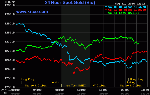 Chốt phiên giao dịch Thứ Tư (ngày 11/05), giá vàng giao tháng Sáu trên sàn Comex tại Sở giao dịch New York Mercantile đảo chiều tăng mạnh $10,70 (+0,9%) lên đóng cửa ở $1.275,50/oz. Tương tự, giá bạc giao tháng Bảy cũng bật 22,7 cents (+1,3%) lên chốt ở $17,319/oz.