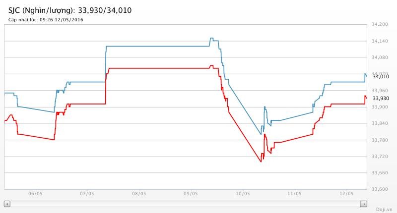 Tương tự, tại các đại lý của Doji, giá vàng miếng SJC cũng được Tập đoàn điều chỉnh tăng 20 nghìn đồng lên yết ở 33,93 – 34,01 triệu đồng/lượng (MV-BR) đối với giao dịch lẻ; và đắt hơn 10 nghìn đồng chiều mua, đồng thời rẻ hơn 10 nghìn đồng chiều bán đối với giao dịch buôn ở thị trường Hà Nội. Hiện, doãng chênh lệch 2 chiều mua-bán ở Doji là 80 nghìn đồng/lượng.