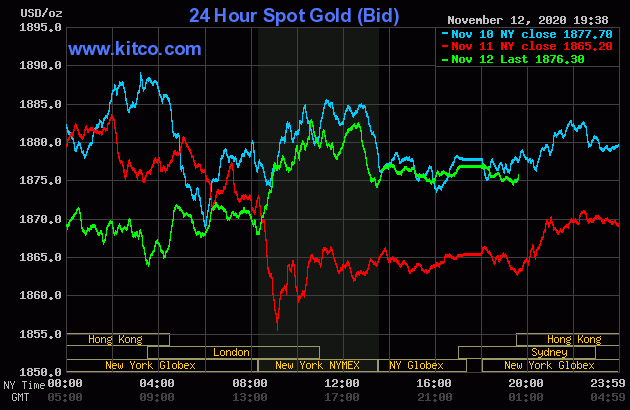 Trên Kitco.com, tại thời điểm 7h30 sáng ngày hôm nay 13/11 (theo giờ Việt Nam), giá vàng giao ngay được giao dịch quanh mức 1.876 USD/ounce, tăng khoảng 11 USD so với giá kết phiên giao dịch gần nhất. Giá vàng giao tháng 12/2021 trên sàn Comex New York được giao dịch ở mức 1.902 USD/ounce.