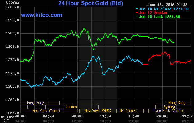 Chốt phiên giao dịch đầu tuần (Thứ Hai ngày 13/06), giá vàng giao tháng Tám trên sàn Comex tại Sở giao dịch New York Mercantile bật mạnh $11,00 (+0,9%) lên đóng cửa ở $1.286,90/oz – đoạt đỉnh kể từ ngày 6/5, theo số liệu của FactSet. Tương tự, giá bạc giao Tháng Bảy cũng tăng 11,3 cents (+0,7%) lên đóng cửa ở $17,443/oz.