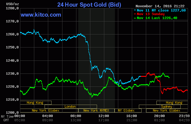 Chốt phiên giao dịch đầu tuần (Thứ Hai ngày 14/11), giá vàng giao tháng Mười hai trên sàn Comex tại Sở giao dịch New York Mercantile khẽ trôi $2,60 (-0,2%) xuống đóng cửa ở $1.221,70/oz. Đáng nói là trước đó trong phiên, kim loại quý này hầu hết giao dịch trong khu vực $1.230,90/oz.