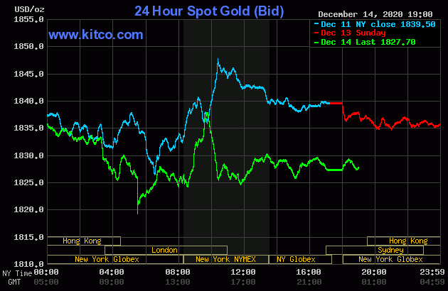 Trên Kitco.com, tại thời điểm 7h sáng ngày hôm nay 15/12 (theo giờ Việt Nam), giá vàng giao ngay được giao dịch ở mức 1.827,7 USD/ounce, giảm 12 USD so với giá kết phiên giao dịch gần nhất. Giá vàng giao tháng 12/2021 trên sàn Comex New York được giao dịch ở mức 1.845 USD/ounce.