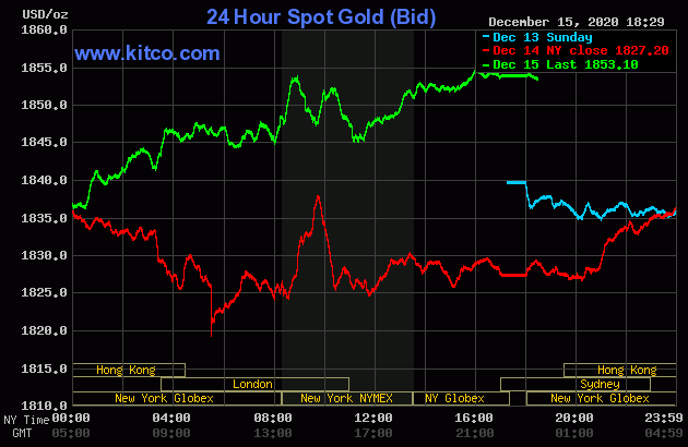 Trên Kitco.com, tại thời điểm 6h30 sáng ngày hôm nay 16/12 (theo giờ Việt Nam), giá vàng giao ngay được giao dịch ở mức 1.853 USD/ounce, tăng 25 USD so với giá kết phiên giao dịch gần nhất. Giá vàng giao tháng 12/2021 trên sàn Comex New York được giao dịch ở mức 1.871 USD/ounce.