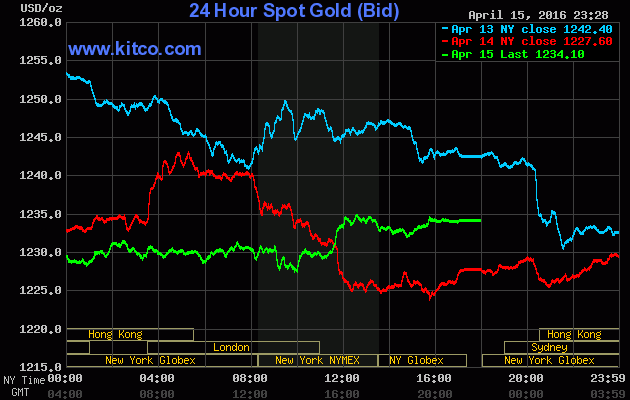 Chốt phiên giao dịch cuối tuần (Thứ Sáu ngày 15/04), giá vàng giao tháng Sáu trên sàn Comex tại Sở giao dịch New York Mercantile đảo chiều leo mạnh $8,10 (+0,7%) lên đóng cửa ở $1.234,60/oz.
