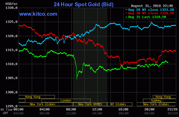 Chốt phiên giao dịch Thứ Tư (ngày 31/08), giá vàng giao tháng Mười hai trên sàn Comex tại Sở giao dịch New York Mercantile trôi sâu $5,10 (-0,4%) xuống đóng cửa ở $1.311,40/oz – khoét đáy kể từ ngày 23/6. Tính chung trong cả tháng 8, giá vàng trượt tổng cộng 3,4% - căn cứ theo dữ liệu của FactSet.