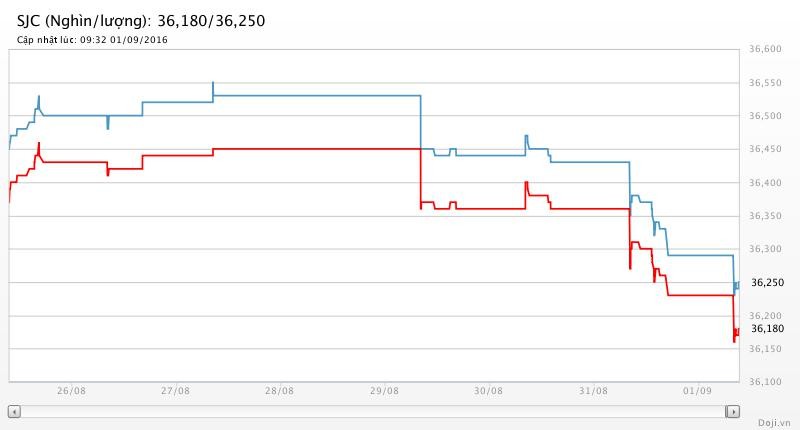Tương tự, tại các đại lý của Doji, giá vàng miếng SJC cũng được Tập đoàn điều chỉnh giảm 50 nghìn đồng chiều mua và 40 nghìn đồng chiều bán về yết ở 36,18 – 36,25 triệu đồng/lượng (MV-BR) đối với giao dịch lẻ; và đắt hơn 10 nghìn đồng chiều mua, đồng thời rẻ hơn 10 nghìn đồng chiều bán đối với giao dịch buôn ở thị trường Hà Nội. Hiện, doãng chênh lệch 2 chiều mua - bán ở Doji là 70 nghìn đồng/lượng.