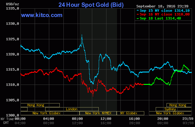 Chốt phiên giao dịch cuối tuần trước (Thứ Sáu ngày 16/09), giá vàng giao tháng Mười hai trên sàn Comex tại Sở giao dịch New York Mercantile tiếp tục trôi sâu $7,80 (-0,6%) xuống đóng cửa ở $1.310,20/oz, khoét đáy kể từ ngày 23/6. Tính chung trong cả tuần, giá vàng trượt 1,8% - căn cứ theo dữ liệu của FactSet.
