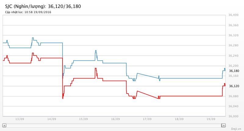 Tương tự, tại các đại lý của Doji, giá vàng miếng SJC cũng được Tập đoàn điều chỉnh tăng 40 nghìn đồng mỗi lượng chiều mua và 30 nghìn đồng mỗi lượng chiều bán lên yết ở 36,12 – 36,18 triệu đồng/lượng (MV-BR) đối với giao dịch lẻ; và đắt hơn 10 nghìn đồng chiều mua, đồng thời rẻ hơn 10 nghìn đồng chiều bán đối với giao dịch buôn ở thị trường Hà Nội. Hiện, doãng chênh lệch 2 chiều mua - bán ở Doji là 60 nghìn đồng/lượng.