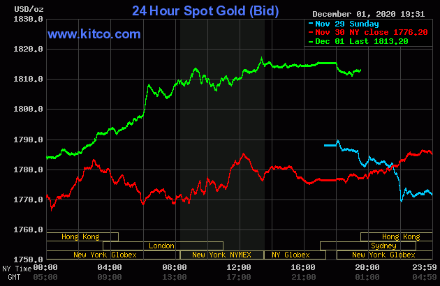 Trên Kitco.com, tại thời điểm 7h30 sáng ngày hôm nay 2/12 (theo giờ Việt Nam), giá vàng giao ngay được giao dịch ở mức 1.813 USD/ounce, tăng 37 USD so với giá kết phiên giao dịch gần nhất. Giá vàng giao tháng 12/2021 trên sàn Comex New York được giao dịch ở mức 1.829 USD/ounce.