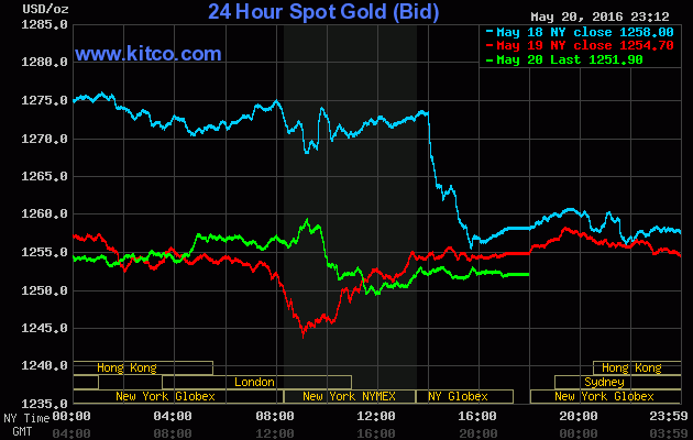 Chốt phiên giao dịch cuối tuần (Thứ Sáu ngày 20/05), giá vàng giao tháng Sáu trên sàn Comex tại Sở giao dịch New York Mercantile giảm tiếp $1,90 (-0,2%) xuống đóng cửa ở $1.252,90/oz; khoét đáy kể từ ngày 27 tháng Tư. Và tính chung cả tuần, giá vàng đã rơi 1,6%, không khác biệt quá nhiều so với mức giảm 1,7% của tuần trước đó.