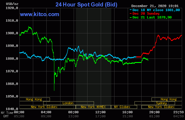 Trên Kitco.com, tại thời điểm 7h sáng ngày hôm nay 22/12 (theo giờ Việt Nam), giá vàng giao ngay được giao dịch ở mức 1.878 USD/ounce, tăng 4 USD so với giá kết phiên giao dịch gần nhất. Giá vàng giao tháng 12/2021 trên sàn Comex New York được giao dịch ở mức 1.896 USD/ounce.