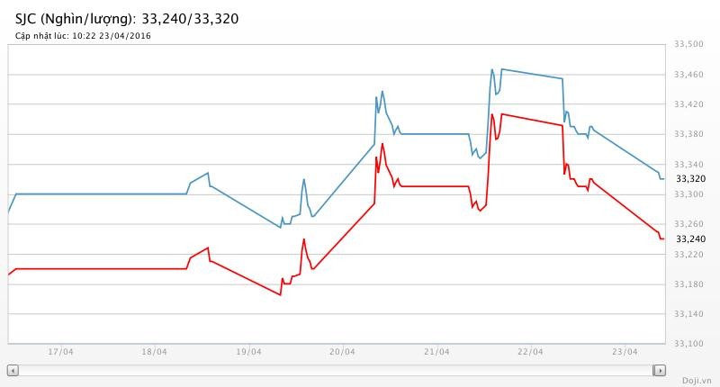 Tương tự, tại các đại lý Doji, giá vàng miếng SJC cũng được Tập đoàn điều chỉnh giảm 70 nghìn đồng chiều mua và 60 nghìn đồng chiều bán xuống đứng ở 33,24 – 33,32 triệu đồng/lượng (MV-BR) đối với giao dịch lẻ; và đắt hơn 10 nghìn đồng chiều mua, đồng thời rẻ hơn 10 nghìn đồng chiều bán đối với giao dịch buôn ở thị trường Hà Nội. Với biểu giá này, doãng chênh lệch 2 chiều mua – bán vàng SJC tại Doji hiện là 80 nghìn đồng/lượng.
