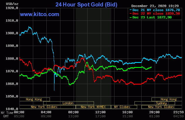 Trên Kitco.com, tại thời điểm 7h30 sáng ngày hôm nay 24/12 (theo giờ Việt Nam), giá vàng giao ngay được giao dịch ở mức 1.873 USD/ounce, tăng 14 USD so với giá kết phiên giao dịch gần nhất. Giá vàng giao tháng 12/2021 trên sàn Comex New York được giao dịch ở mức 1.892 USD/ounce.