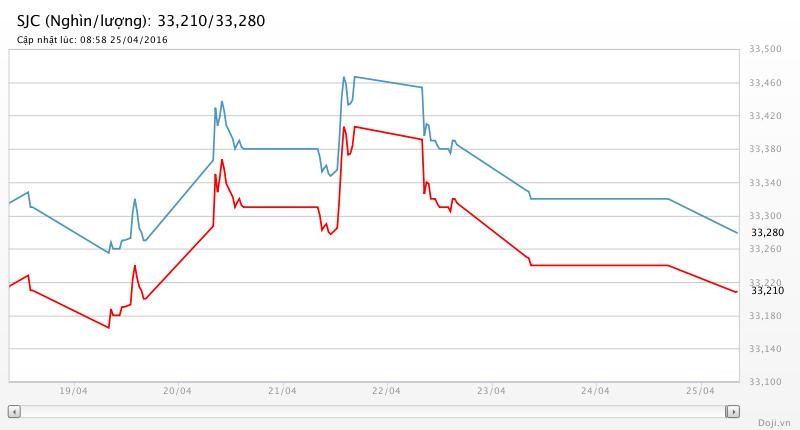 Tương tự, tại các đại lý Doji, giá vàng miếng SJC cũng được Tập đoàn điều chỉnh giảm 30 nghìn đồng chiều mua và 40 nghìn đồng chiều bán xuống đứng ở 33,21 – 33,28 triệu đồng/lượng (MV-BR) đối với giao dịch lẻ; và đắt hơn 10 nghìn đồng chiều mua, đồng thời rẻ hơn 10 nghìn đồng chiều bán đối với giao dịch buôn ở thị trường Hà Nội. Với biểu giá này, doãng chênh lệch 2 chiều mua – bán vàng SJC tại Doji hiện là 70 nghìn đồng/lượng.