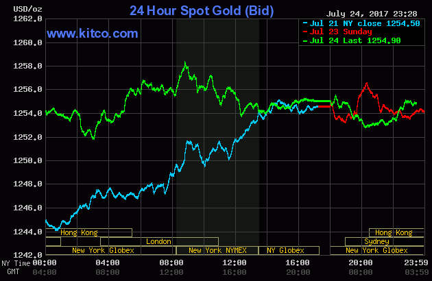 Chốt phiên giao dịch đầu tuần (Thứ Hai ngày 24/7), giá vàng giao tháng Tám trên sàn Comex tại Sở Giao dịch New York Mercantile khẽ hạ 60 cents (-0,1%) về chốt tại $1.254,30/oz, đánh dấu phiên suy đầu tiên sau chuỗi 6 phiên tăng liên tiếp. Đáng nói, trong phiên nhiều thời điểm, giá vàng đã chạm ngưỡng $1.259/oz.