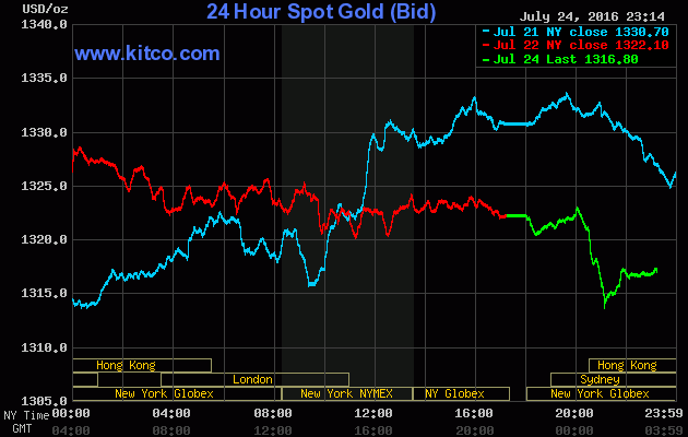 Chốt phiên giao dịch cuối tuần trước (Thứ Sáu ngày 22/07), giá vàng giao tháng Tám trên sàn Comex tại Sở giao dịch New York Mercantile giảm $7,60 (-0,6%) xuống đóng cửa ở $1.323,40/oz, tương ứng giảm nhẹ 0,3% trong cả tuần và đánh dấu tuần rớt giá thứ hai, sau khi trượt mạnh 2,3% trong tuần trước đó – theo dữ liệu của FactSet.